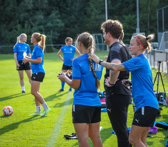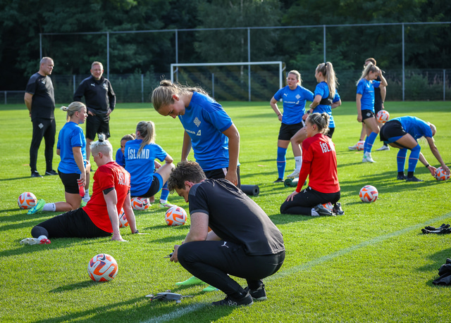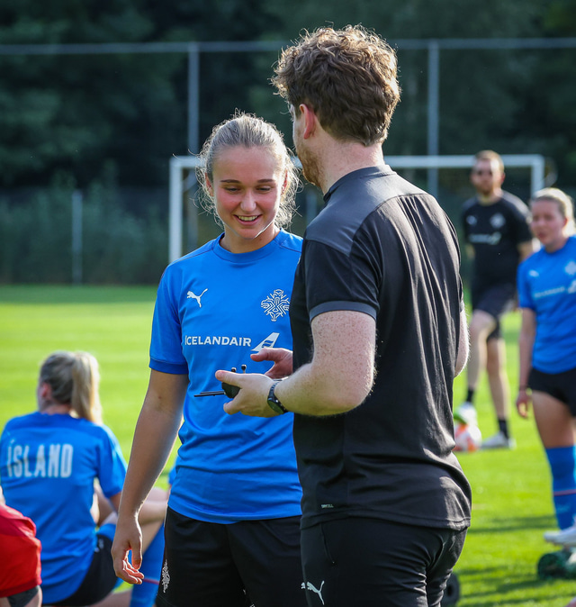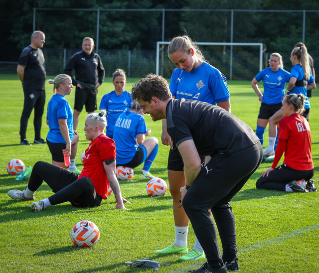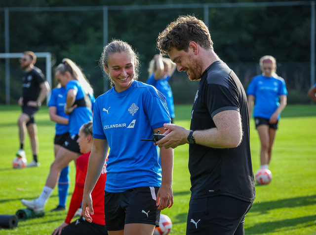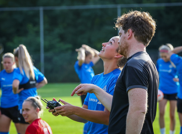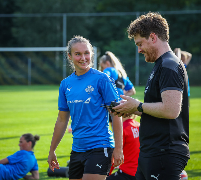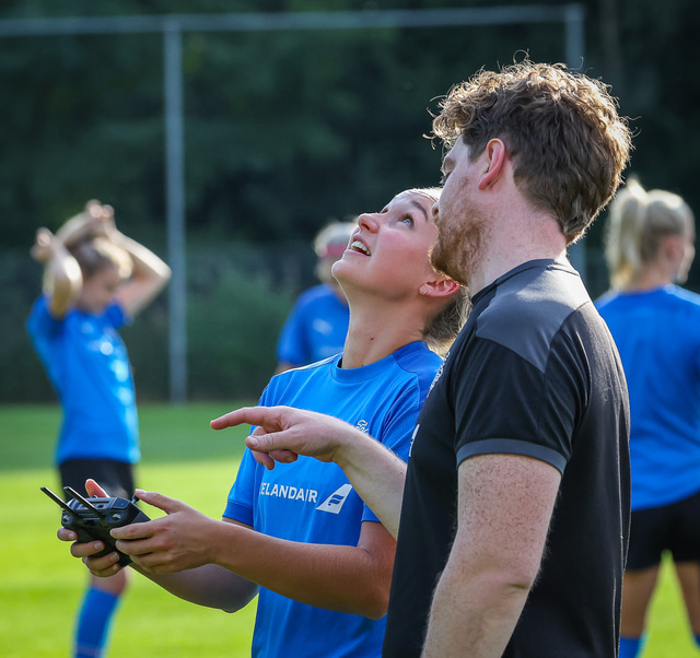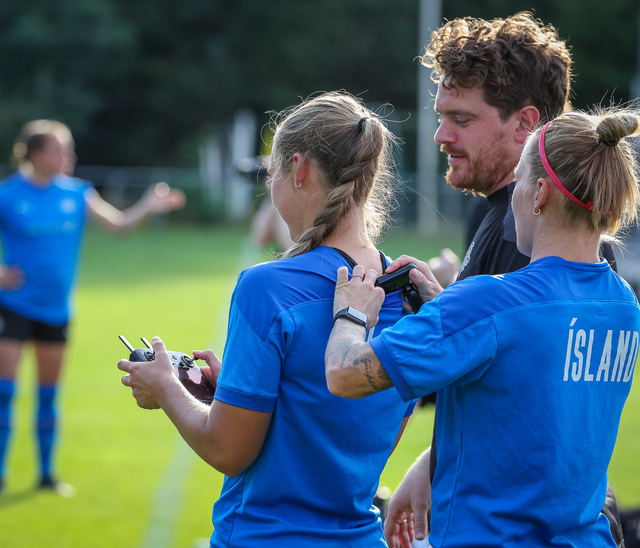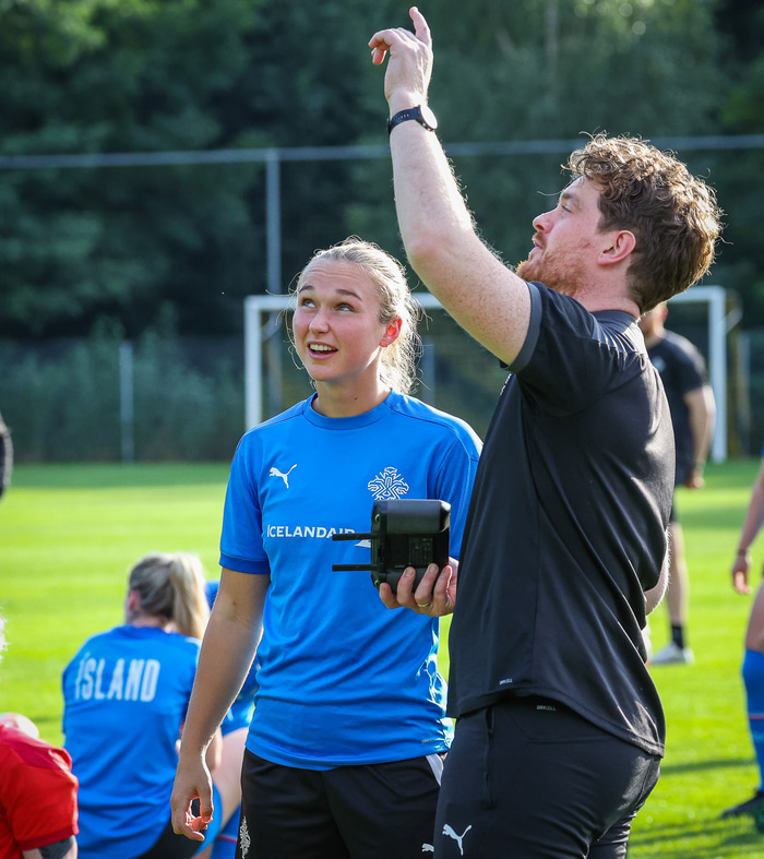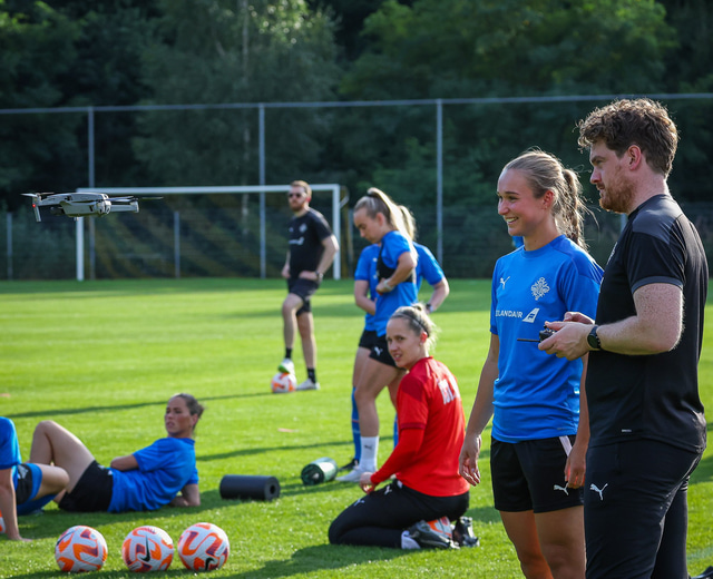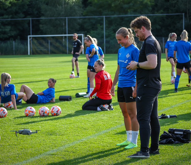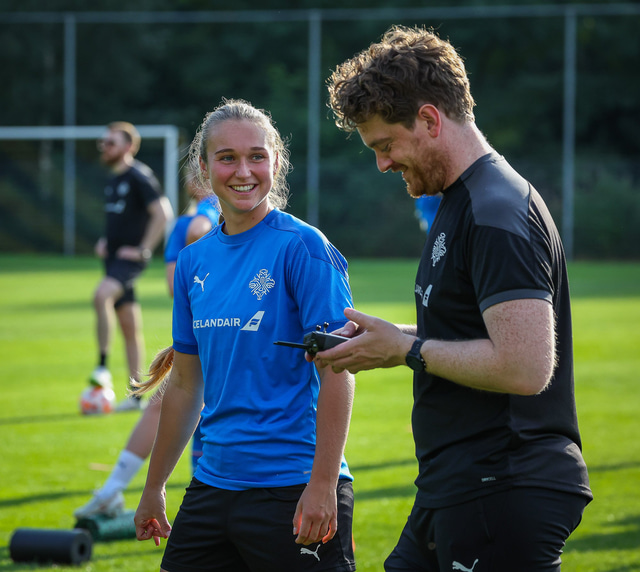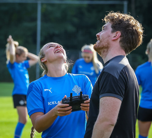 Alexandra Jóhannsdóttir miðjumaður íslenska landsliðsins var mjög forvitin um dróna KSÍ fyrir æfingu liðsins í Hollandi í gær og fékk sjálf að prufukeyra.