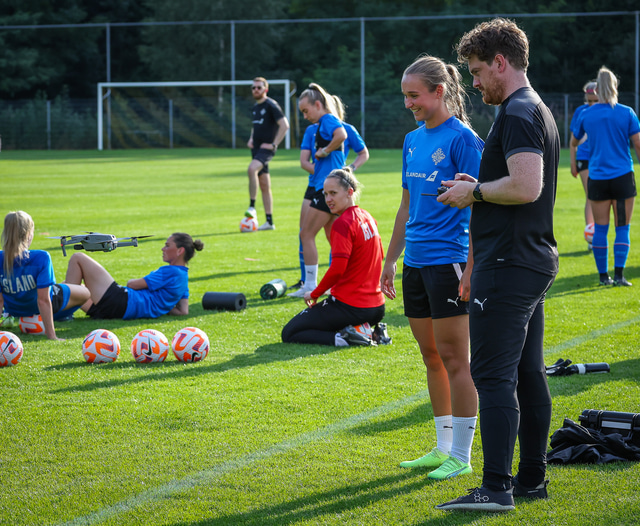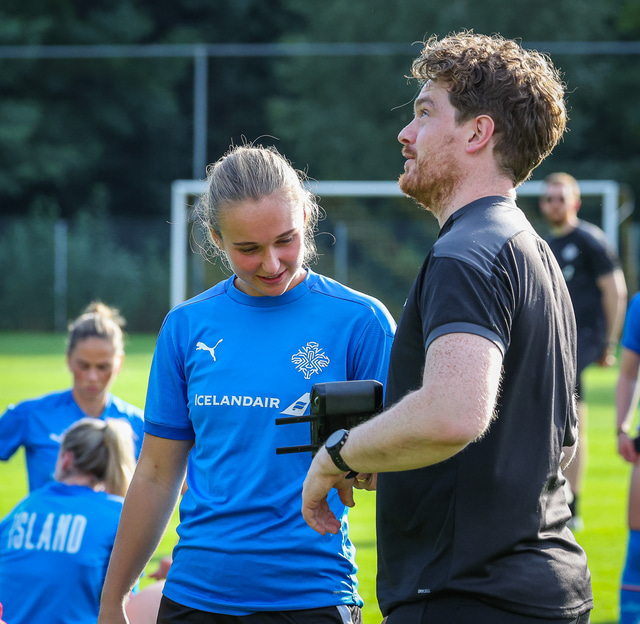 Jóhann Ólafur Sigurðsson fjölmiðlafulltrúi KSÍ var að undirbúa sig undir að hefja drónann á loft þegar Alexandra kom til hans og fór að spyrja spurninga.