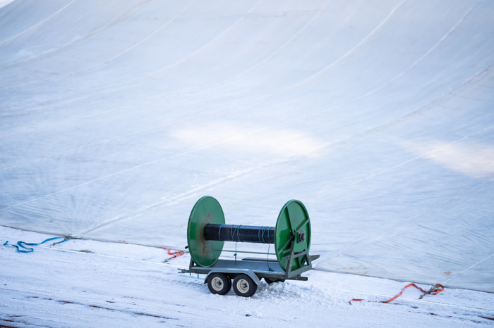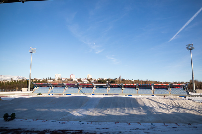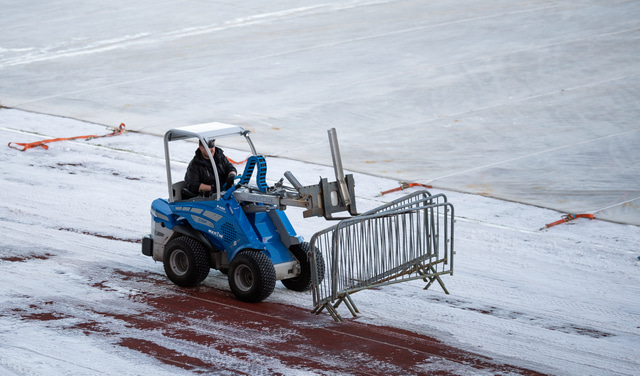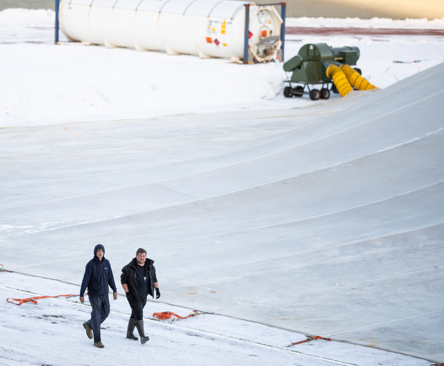 Annar dúkur hefur verið á vellinum undanfarna daga en unnið hefur verið að því að taka snjóinn af þeim dúk í vikunni. Hitadúkurinn kom svo í lok dags.