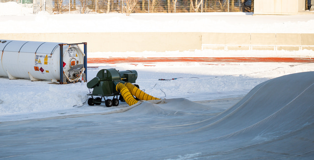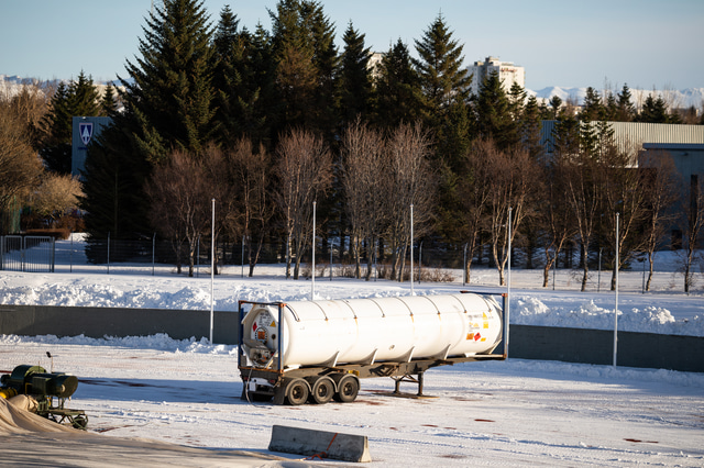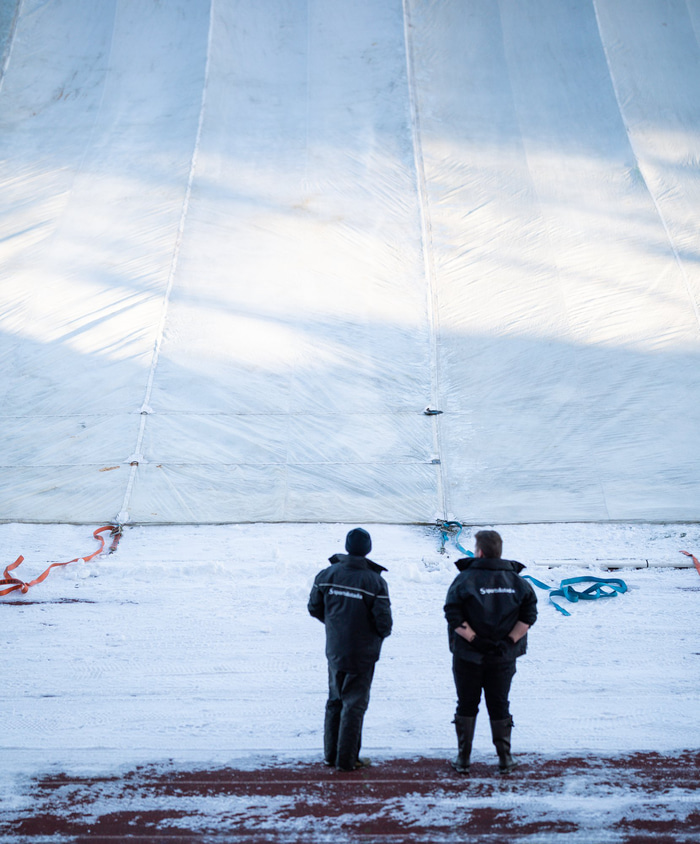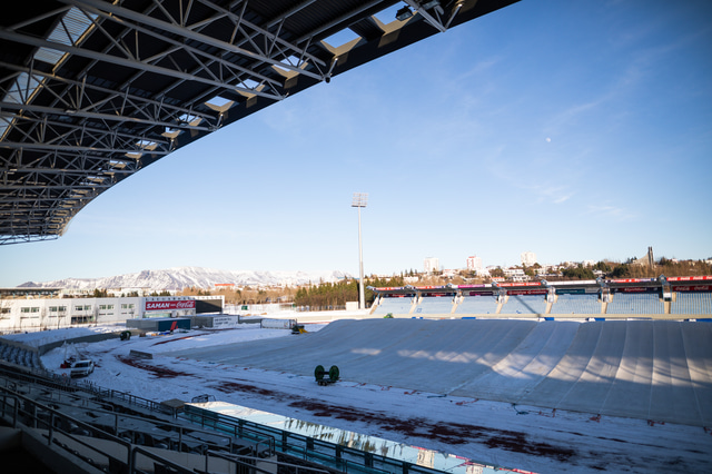 Tveir risa gaskútar knýja hitapulsuna sem er enn að rísa en allt er gert svo völlurinn verði klár fyrir leikinn gegn Rúmeníu í umspili um sæti á EM 2020 sem fer fram 26. mars næstkomandi.