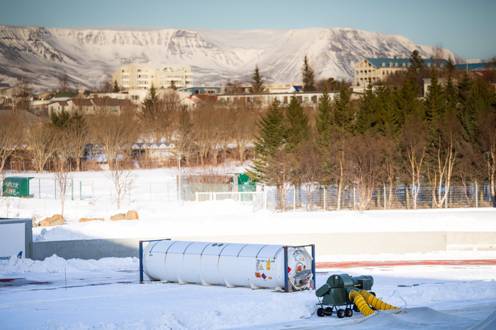 Nú undir kvöld náðist að koma hitapulsunni í gang á Laugardalsvelli en sérfræðingar sem fylgdu henni hingað til lands starfa hér á landi næstu vikurnar.