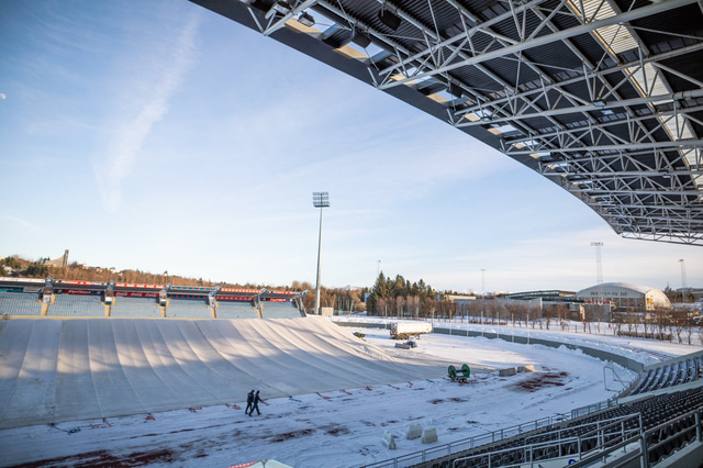 Á næstu þremur vikum verður dúkurinn svo fjarlægður nokkrum sinnum svo hægt sé að valta, mála og mögulega slá grasið. Dúkurinn verður á vellinum allt fram til degi fyrir leik. Myndir af dúknum má sjá hér með fréttinni og að neðan.