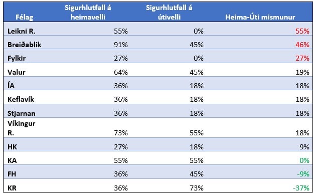 Leiknir Reykjavík hefur einungis sigrað 1 leik á útivelli með 5% sigurhlutfall. Þeir hafa hinsvegar 36% sigurhlutfall á heimavelli sem gefur okkur að þeir hafa einning mesta mismuninn á sigurhlutföllum. Á eftir Leikni Reykjavík í mesta mismun á sigurhlutfalli koma ÍA og HK.