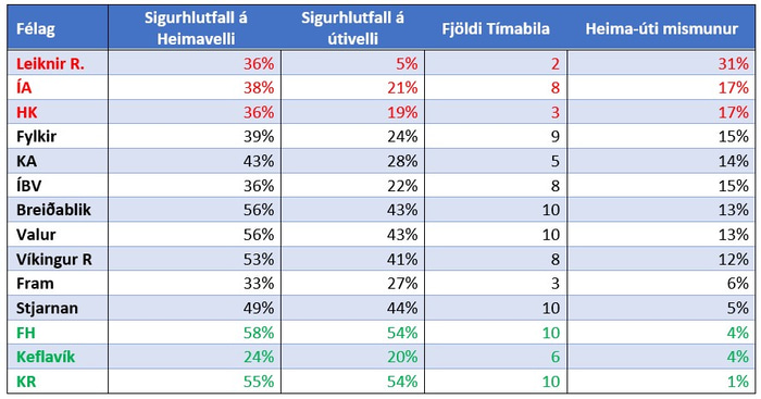 Á sama tíma var markmiðið að líta á hvaða félög það eru sem hafa mestan og minnstan mismun á sigurhlutföllum miðað við hvort þau séu að spila á heima- eða útivelli.
