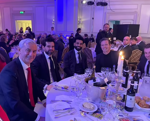 Stuðningsmenn Liverpool eru mjög spenntir eftir að mynd birtist frá verðlaunakvöldverði í London þar sem Mohamed Salah sat ásamt umboðsmanni sínum og íþróttastjórum Liverpool.