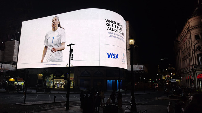Hafliði var á göngu í Lundúnum er hann leit upp og sá þar risaskjá á Picadilly Circus en þar mátti sjá auglýsingu frá kortaframleiðandanum VISA, sem er stoltur styrktaraðili Evrópumótsins.