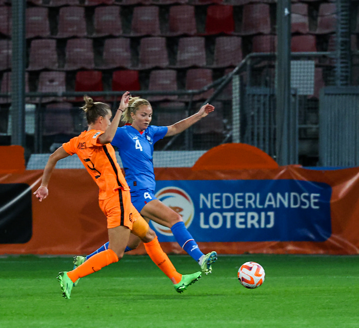 Holland setti mikla pressu á íslenska liðið og átti þrjú sláarskot í fyrri hálfleik og þá bjargaði Guðný Árnadóttir á línu.