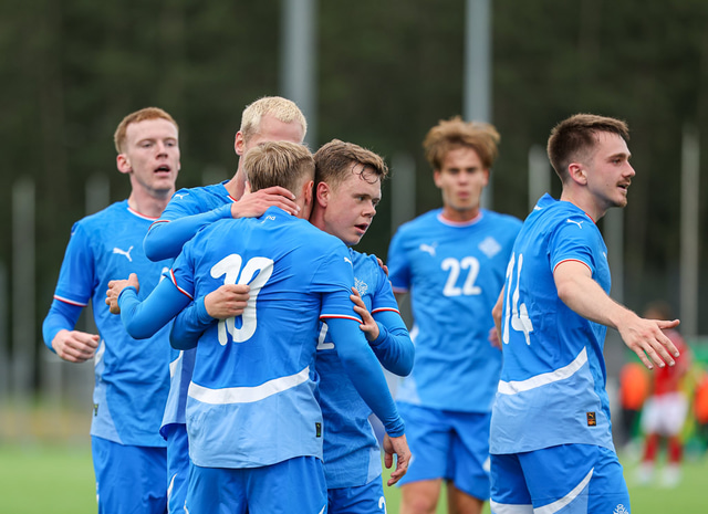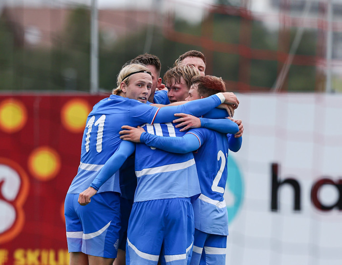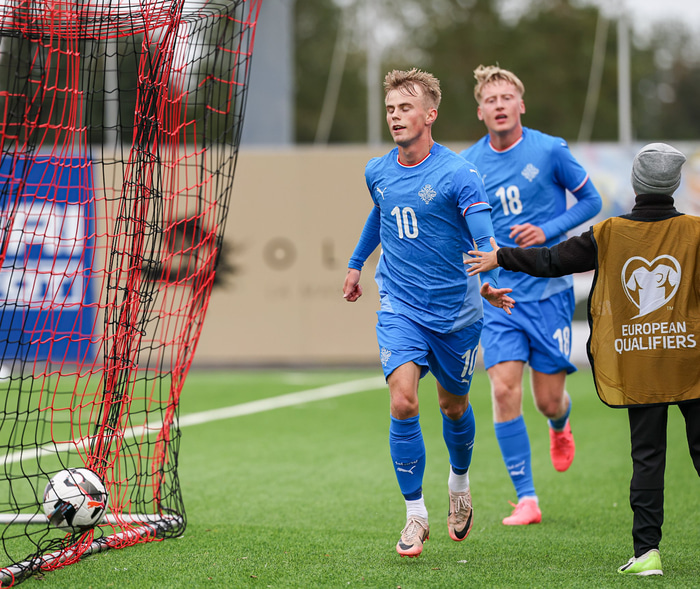 En tveir Víkingar sneru leiknum við fyrir íslenska liðið; Kristall Máni jafnaði metin á 28. mínútu eftir að hafa unnið boltann af varnarmanni Danmerkur og Ari Sigurpálsson mætti svo á fjærstöngina rétt fyrir hálfleik og koma Íslandi yfir.