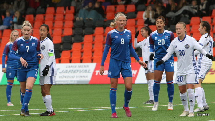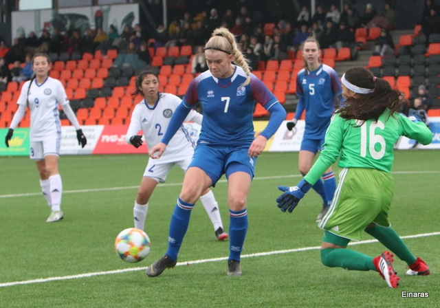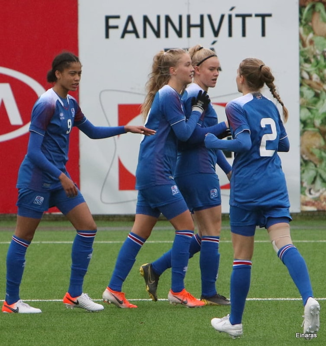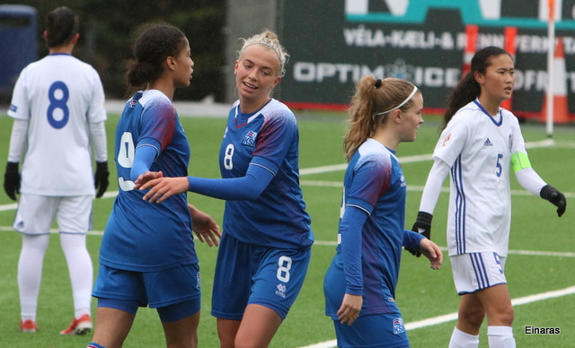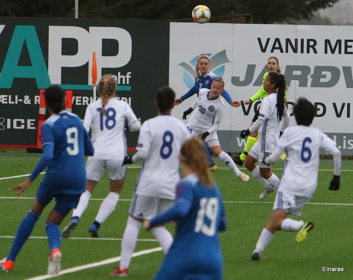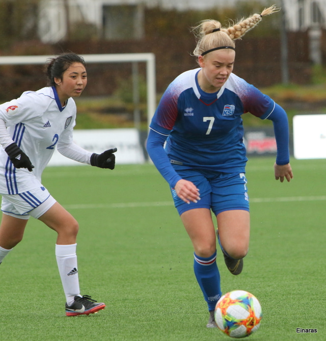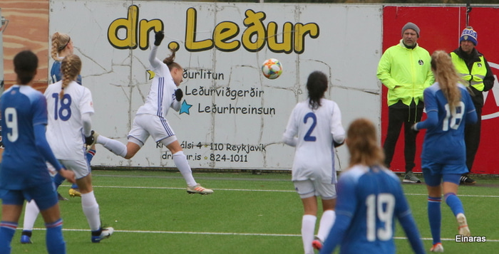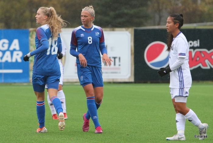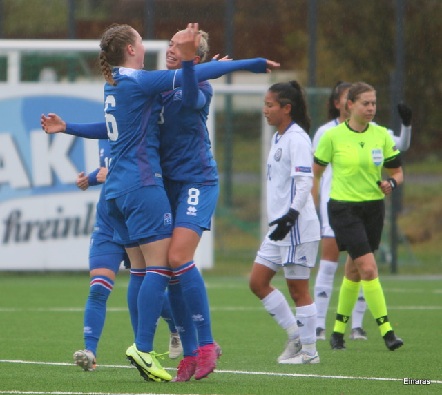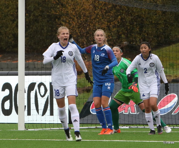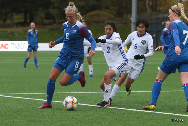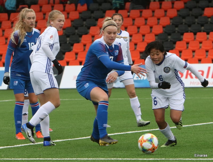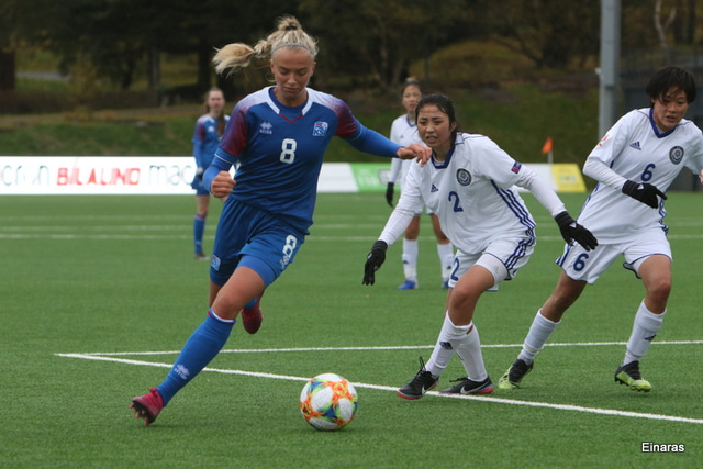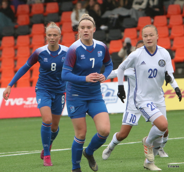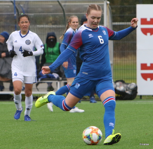 Íslenska kvenna landsliðið skipað leikmönnum 19 ára og yngri mætti Kasakstan í Árbænum í gær í undankeppni EM. Íslensku stelpurnar unnu leikinn örugglega, 7-0.