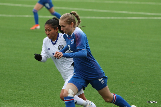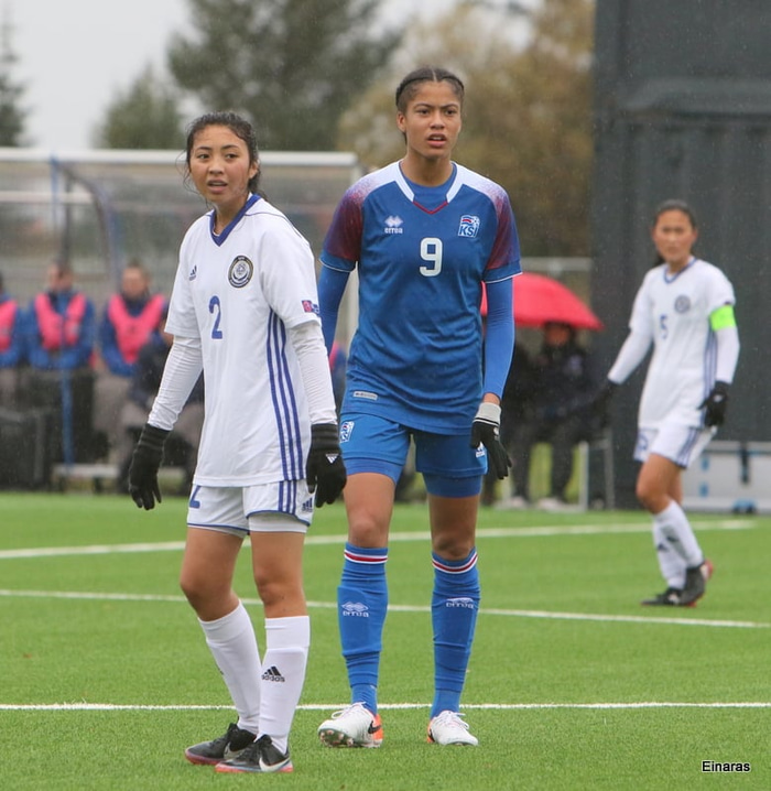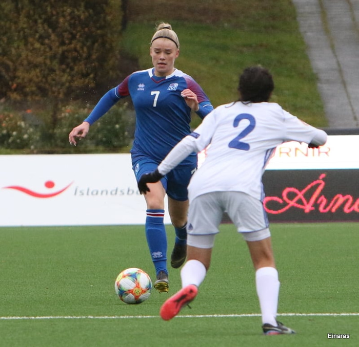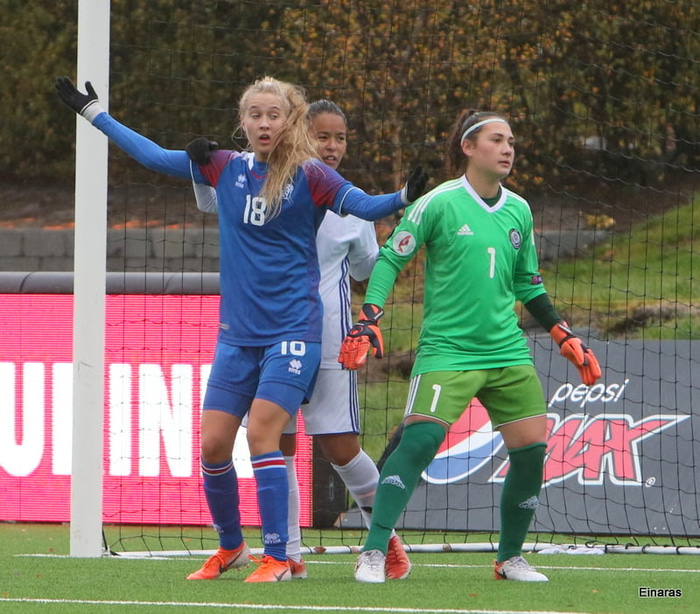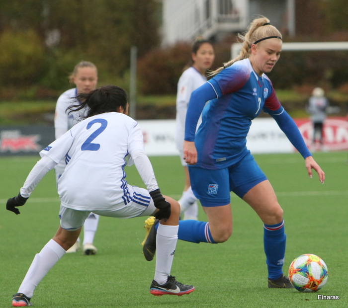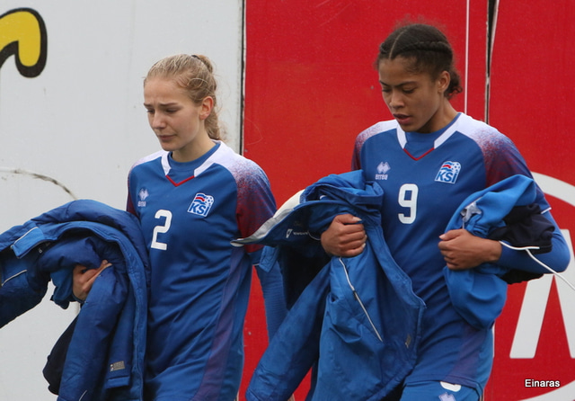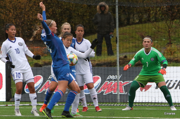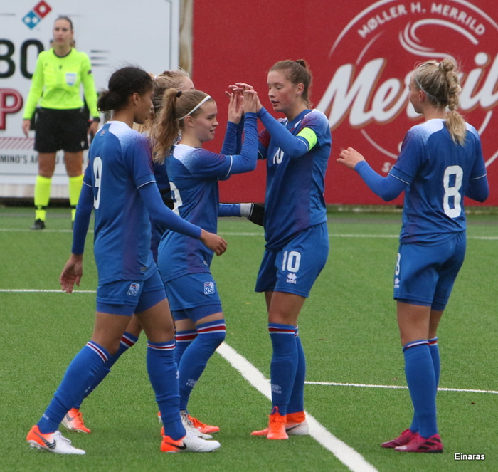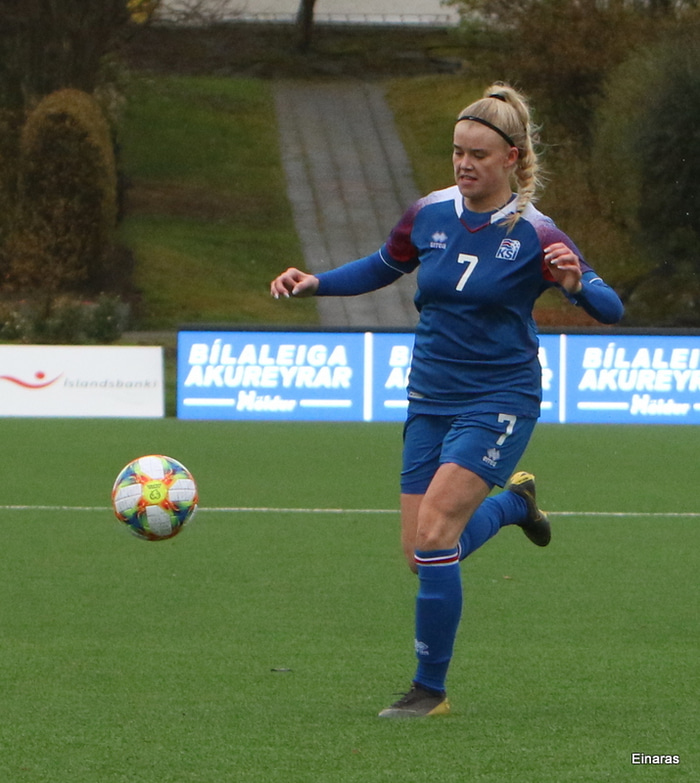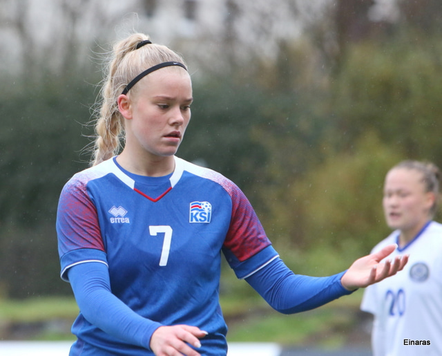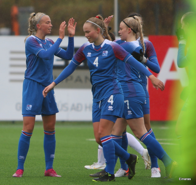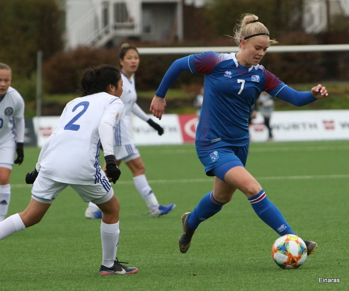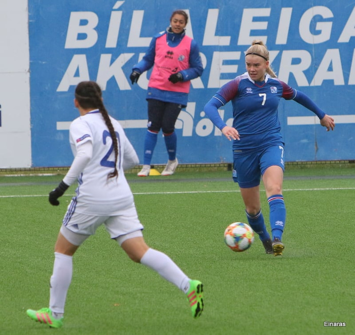 Íslenska kvenna landsliðið skipað leikmönnum 19 ára og yngri mætti Kasakstan í Árbænum í gær í undankeppni EM. Íslensku stelpurnar unnu leikinn örugglega, 7-0.