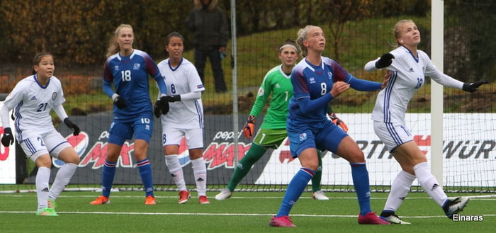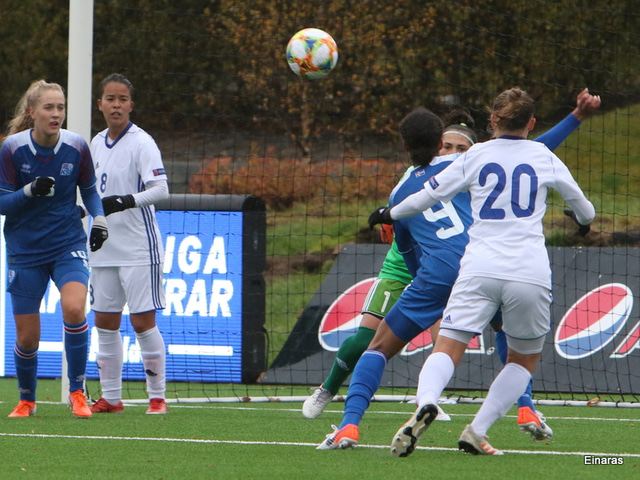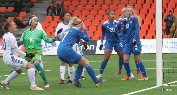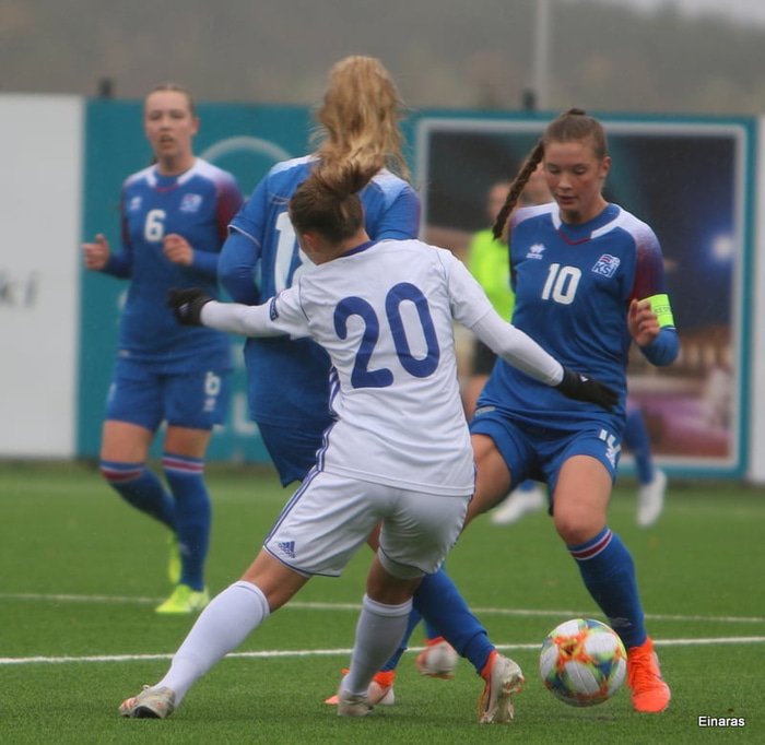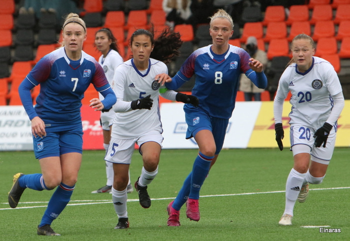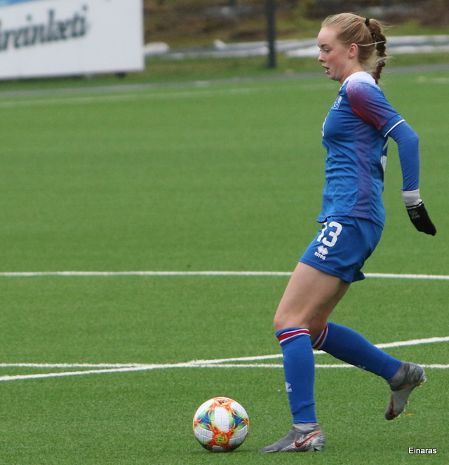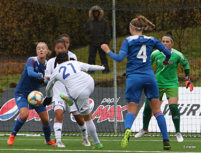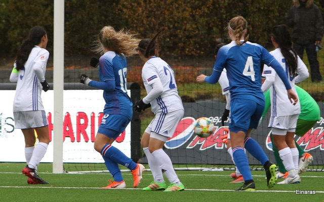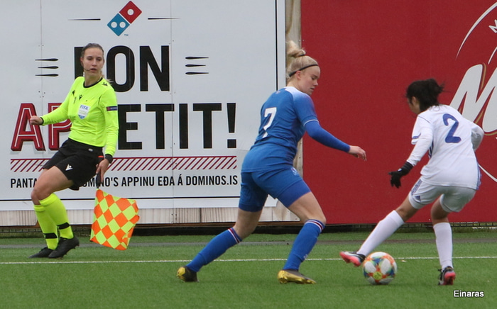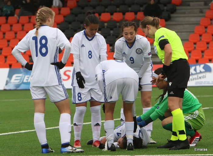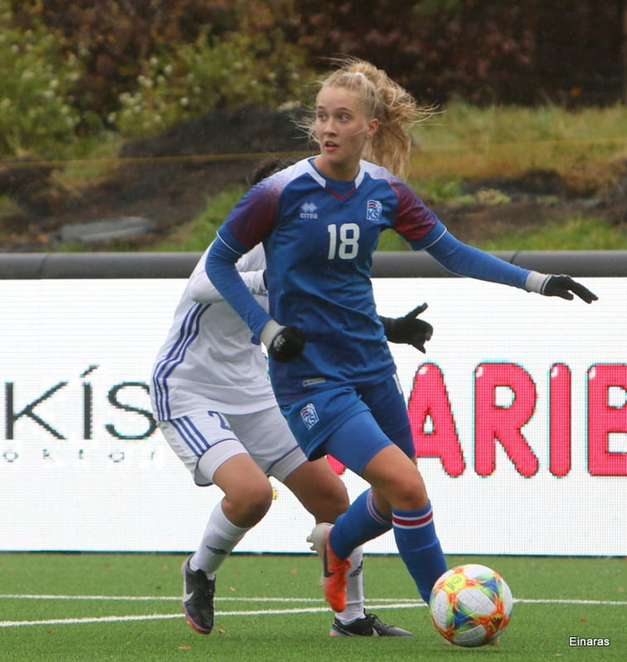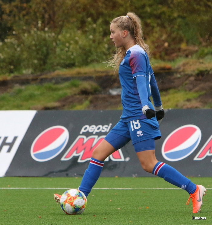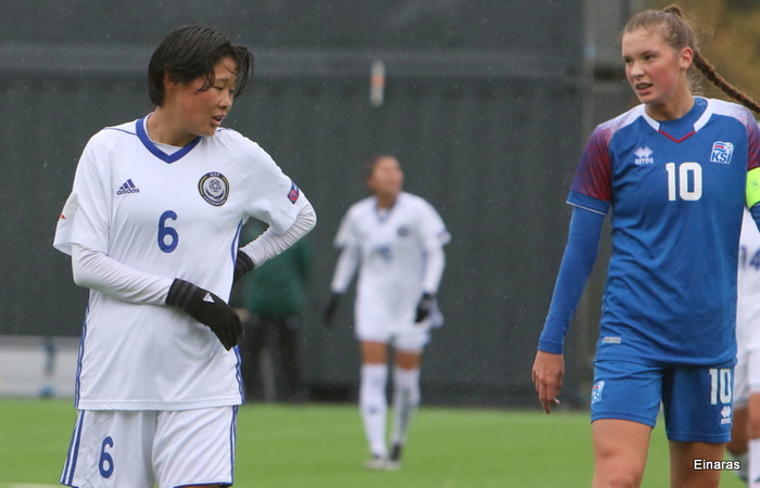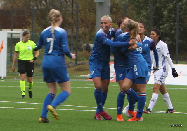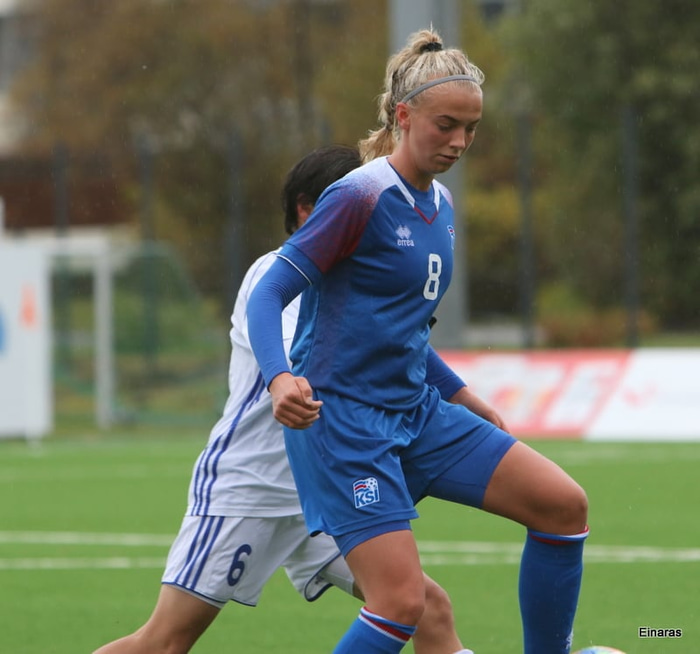 Íslenska kvenna landsliðið skipað leikmönnum 19 ára og yngri mætti Kasakstan í Árbænum í gær í undankeppni EM. Íslensku stelpurnar unnu leikinn örugglega, 7-0.