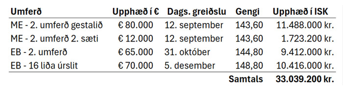 Næsti leikur Breiðabliks var í 16-liða úrslitum Evrópubikarsins en þar mættu þær danska liðinu Fortuna Hjörring og fengu fyrir vikið 70 þúsund evrur. Sú fjárhæð var greidd í gær. Miðað við evrugengi gærdagsins þá fékk Breiðablik 10.416.00 krónur. Það kemur sér vel fyrir Breiðablik að krónan hefur veikst um 2,8% gagnvart evrunni frá síðustu greiðslu fyrir tæpum mánuði síðan.