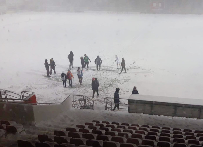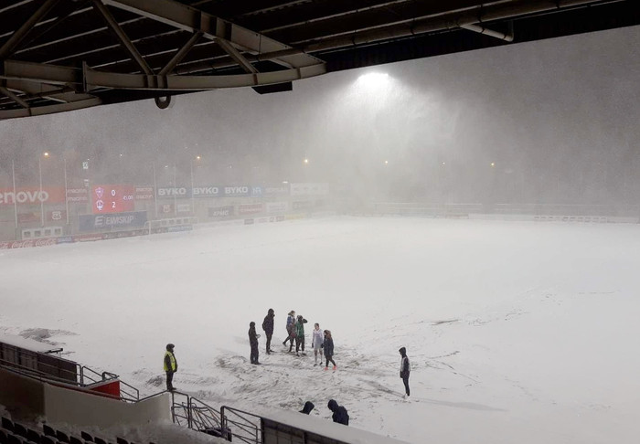 Það er hins vegar búið að flauta þennan leik af en veðrið lét svo sannarlega vita af sér og var ákveðið að stöðva hann í hálfleik.