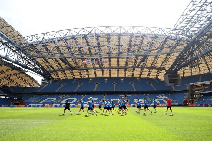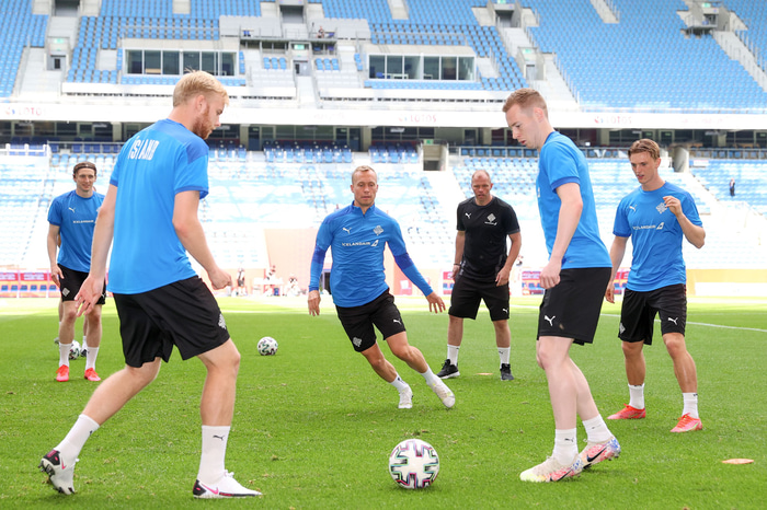 Meðfylgjandi myndir eru fá æfingu Íslands á keppnisvellinum í dag.