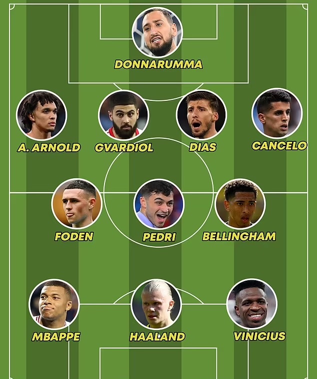Jude Bellingham, sem spilaði með Haaland hjá Dortmund, er í liðinu en verðmæti þessa 18 ára leikmanns hefur aukist gríðarlega síðan hann fór til Þýskalands frá Birmingham City 2020. Hann er á ungri miðju þar sem einnig er Pedri, stjarna Barcelona.