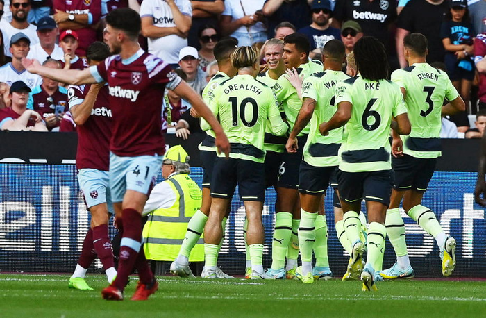 Englandsmeistarar Manchester City unnu West Ham, 2-0, á London-leikvanginum í fyrstu umferð ensku úrvalsdeildarinnar í dag. Erling Braut Haaland gerði bæði mörk gestanna og það í fyrsta deildarleik sínum fyrir félagið.