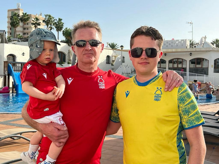 Sólmundur Örn Jónsson (hér til hægri) er stuðningsmaður Forest. Hér er hann með föður sínum og litla frænda sínum.