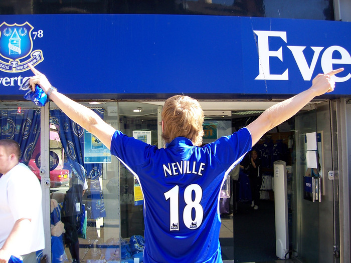 Ég í glænýja Phil Neville-búningnum mínum, fyrir fyrsta og eina heimaleik Everton í umspili fyrir meistaradeildina gegn Villareal 9. ágúst. Konan í Everton-búðinni spurði mig hvort ég væri viss þegar ég bað um Neville aftan á búninginn. Ég á líka Hibbert-búning.