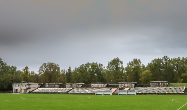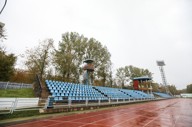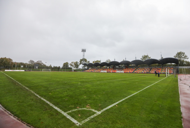 Það er ekki hægt að segja að Daugava leikvangurinn í Liepaja sé mjög tignarlegt mannvirki en í kringum völlinn er plássfrek hlaupabraut svo stelpunum ætti að líða eins og þær séu heima á Laugardalsvelli.