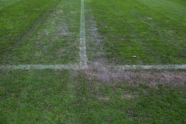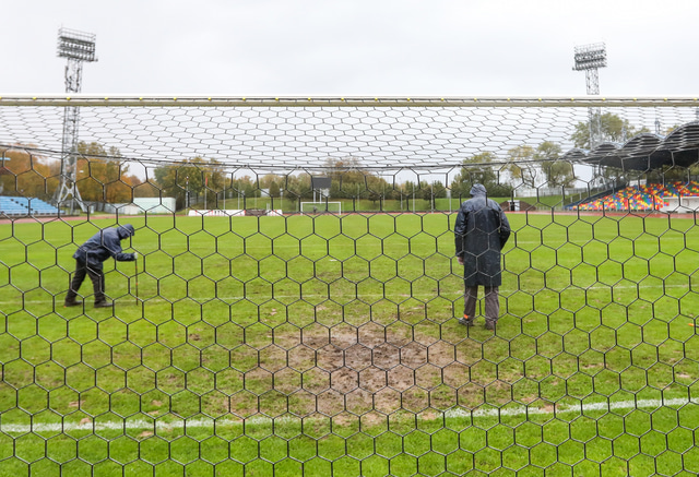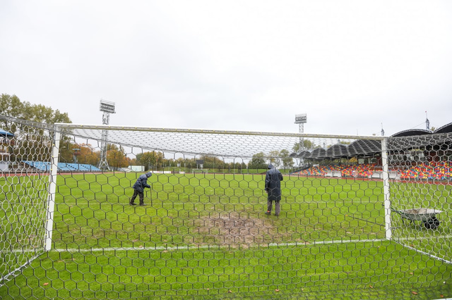 Fótbolti.net skoðaði keppnisvöllinn í dag þar sem Hafliði Breiðfjörð tók meðfylgjandi myndir. Fjórir vallarstarfsmenn voru þá að störfum og var sérstök áhersla á að reyna að lagfæra markteigana en þar er drullusvað eins og sjá má á myndunum.