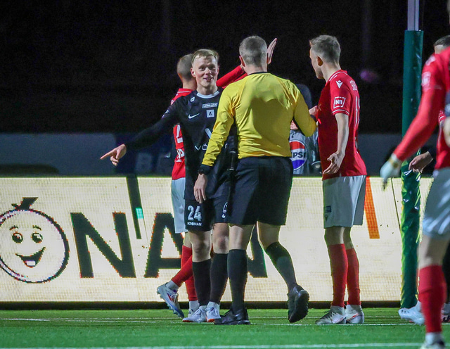 Aron fagnaði í andlitið á Arnóri Gauta sem hrinti Valsmanninum í grasið. Aron flaug með tilþrifum nokkra metra en Elías Ingi Árnason dómari hélt ró sinni, veiti Arnóri Gauta aftur tiltal og þegar hann lét ekki segjast og hélt áfram að atast í Aroni ýtti Elías Ingi honum í burtu eins og meðfylgjandi myndir sýna.