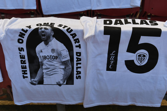 Leeds er þessa stundina að spila gegn Arsenal á Emirates en leikmenn Leeds hituðu upp í bolum merktum Dallas og stuðningsmenn liðsins sem eru mættir til London eru einnig í bolunum.