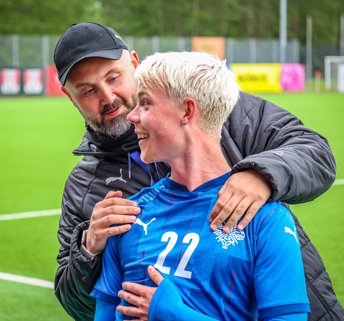 Ágúst eftir leik með U21 landsliðsins í síðustu viku. Með honum á myndinni er Davíð Snorri, þjálfari U21.