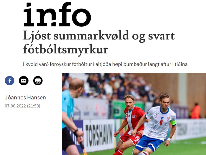„Ljóst summarkvøld og svart fótbóltsmyrkur - Í kvøld varð føroyskur fótbóltur í altjóða høpi bumbaður langt aftur í tíðina," segir fyrirsögn færeyska miðilsins in.fo eftir 0-1 tap Færeyja gegn Lúxemborg í Þjóðadeildinni.
