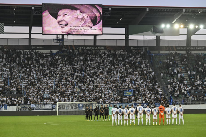 Elísabet önnur, drottning Bretlands, lést fyrr í dag og var tilkynnt um andlát hennar á meðan fyrri hálfleik leiksins stóð.