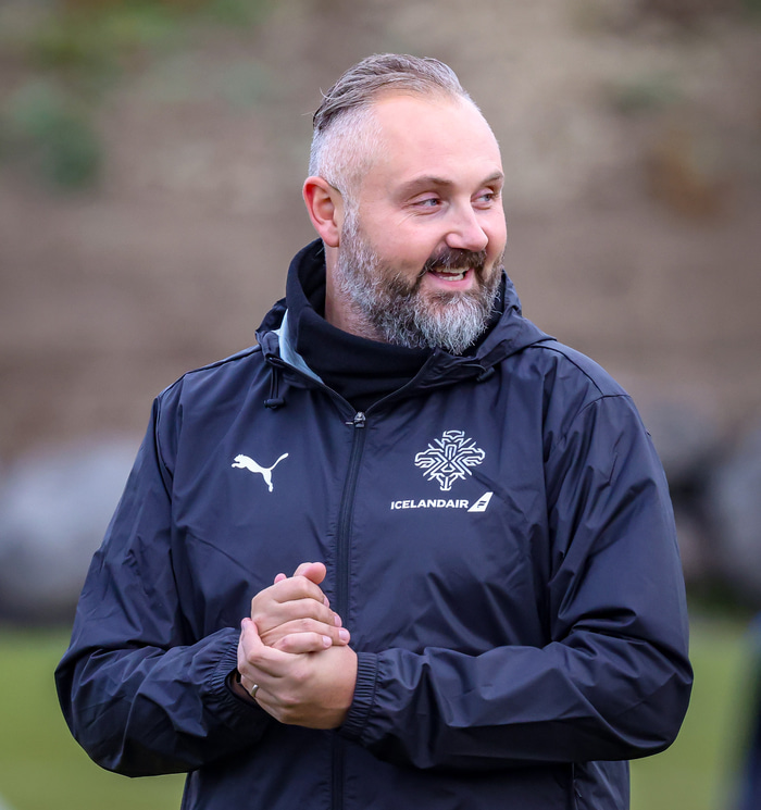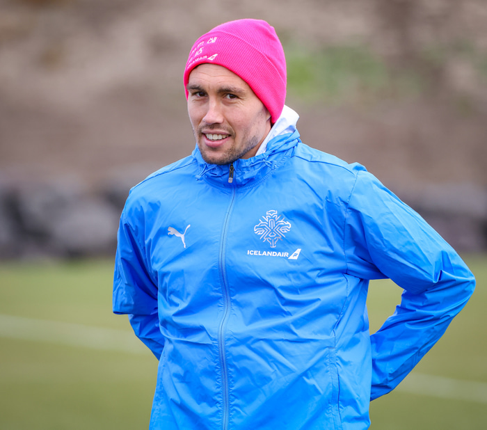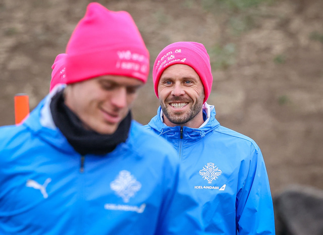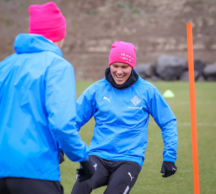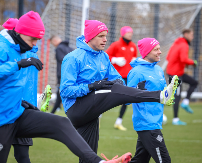Orri Steinn Óskarsson var mættur frá Spáni þar sem hann býr í dag og var greinilega mjög kalt framan af, rétt leyfði augunum að skjótast fram úr kuldagallanum og íslensku leikmennirnir æfðu með bleika húfu í bleikum október eins og sjá má á meðfylgjandi myndum.