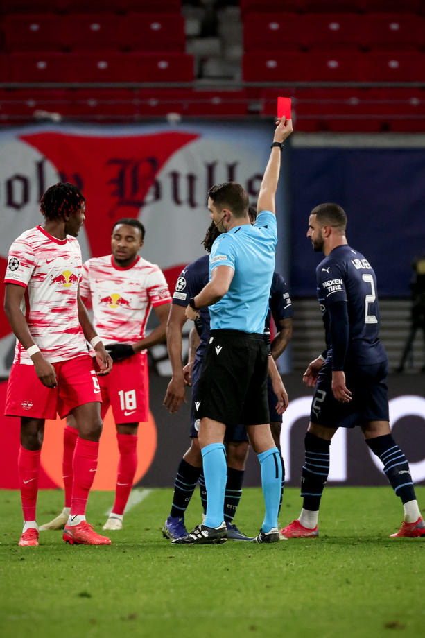 Kyle Walker fékk að líta rauða spjaldið þegar Manchester City heimsótti RB Leipzig í gær. Walker sparkaði í Andre Silva á 82. mínútu og fékk verðskulda rautt spjald.