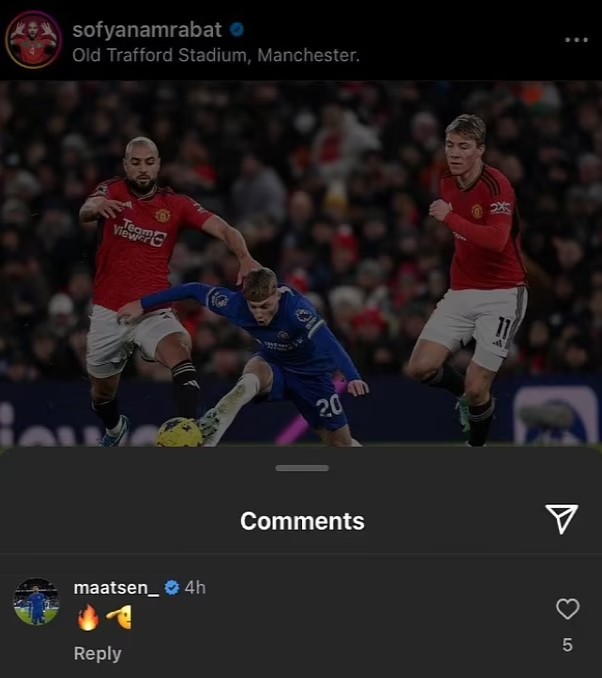 Sofyan Amrabat miðjumaður Manchester United setti inn mynd á Instagram og þakkaði stuðningsmönnum fyrir. Það kom á óvart að einn af leikmönnum Chelsea svaraði póstinum. Maatsen setti inn mynd af eldi og aðra af mynd af manni að senda kveðju.