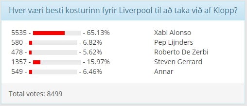 Í skoðanakönnun sem var á forsíðu Fótbolta.net, og um 8.500 manns tóku þátt í, sögðu 65% að Alonso væri besti kosturinn fyrir Liverpool. 16% völdu Steven Gerrard og í þriðja sæti var Pep Lijnders, núverandi aðstoðarmaður Klopp.