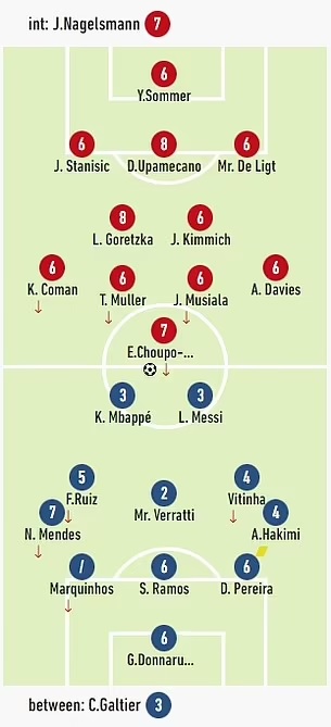 Lionel Messi og Kylian Mbappe fá báðir 3 af 10 í einkunn fyrir 2-0 tapið í Þýskalandi í gær en einn leikmaður fær lægri einkunn, það er ítalski miðjumaðurinn Marco Verratti sem fær 2/10.