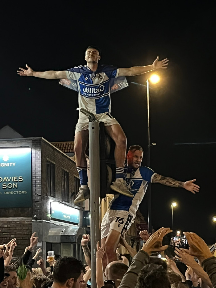Þetta þýddi að Bristol væri á leið í ensku C-deildina. En dramatíkin var ekki búin því stuðningsmenn félagsins hljópu inn á völlinn með blys og voru byrjaðir að fagna. Það tók sinn tíma að koma þeim af vellinum og einhverjum fimmtán mínútum síðar fór leikurinn aftur af stað.