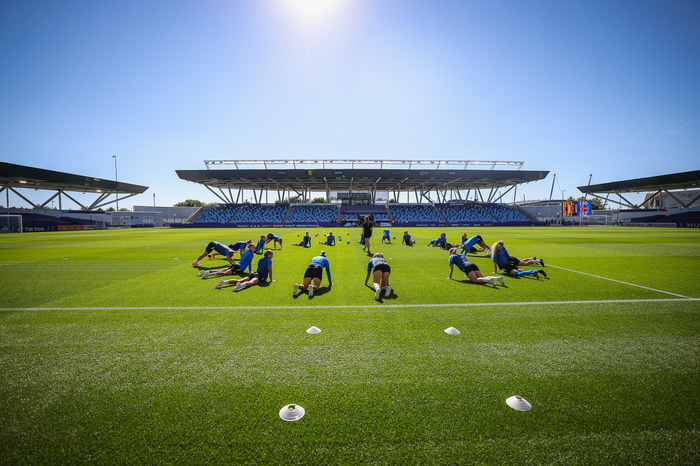 „Ég held að leikmönnum hljóti að líða ótrúlega vel. Hér er sól og blíða, frábærar vallaraðstæður. Það styttist óðum í leik, leik sem margar eru búnar að bíða eftir í fimm ár. Ég held ég að tilhlökkunin sé fyrst og fremst mikil og góð pressa. Það að koma hingað og æfa er góð næring held ég," sagði Margrét Lára.