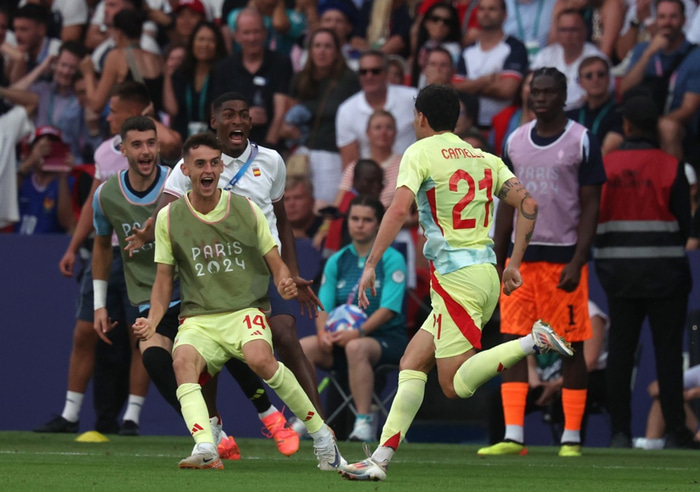 Frakkar komust yfir þegar Enzo Millot nýtti sér mikinn vandræðagang í vörn Spánverja og átti skot sem fór beint á Arnau Tenas en honum tókst ekki að halda boltanum frá því að enda í netinu.