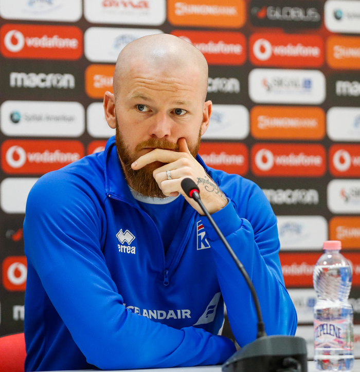 Aron Einar Gunnarsson, landsliðsfyrirliði, mætti á blaðamannafund, ásamt Erik Hamren í Elbasan í Albaníu í dag.