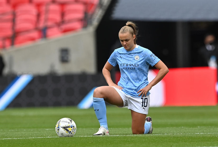 Á 35. mínútu fékk Georgia Stanway beint rautt spjald fyrir skelfilegt brot á Leah Galton.