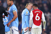 Eftir að Manchester City jafnaði undir lok stórleiksins gegn Arsenal kastaði Erling Braut Haaland, framherji City, boltanum í hausinn á Gabriel.
