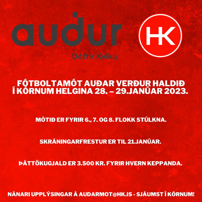 Fótboltamót Auðar verður haldið í Kórnum helgina 28. – 29. janúar 2023.
