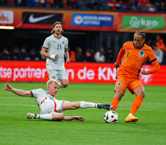 Íslenska liðið sinnti varnarvinnunni nokkuð vel í fyrri hálfleik en hollenska liðinu tókst að brjóta múrinn þegar Xavi Simons kom boltanum í netið og skoraði þar með sitt fyrsta landsliðsmark.