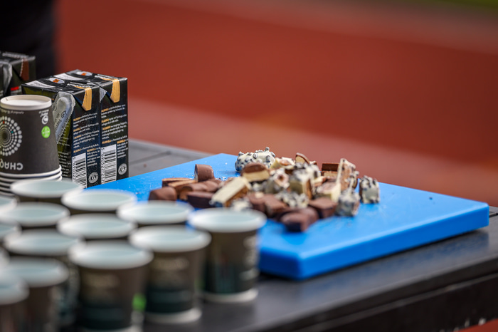 Vaninn er að boðið sé upp á orkudrykki á borði við völlinn þegar liðið æfir en að þessu sinni var diskur með konfektmolum.