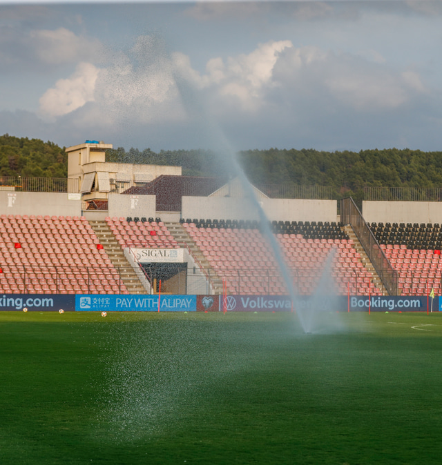 Ísland mætir Albaníu á vellinum í undankeppni EM 2020 klukkan 18:45 í kvöld og fékk því að æfa þar í gær.