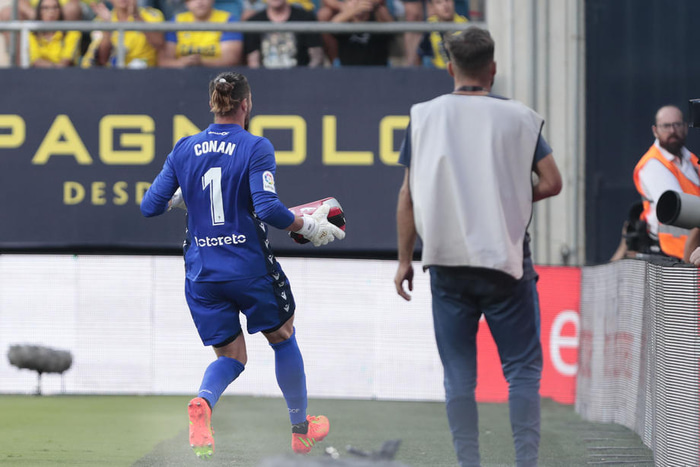 Cadiz goalkeeper Ledesma helps the person in the stands by delivering a medical kit.