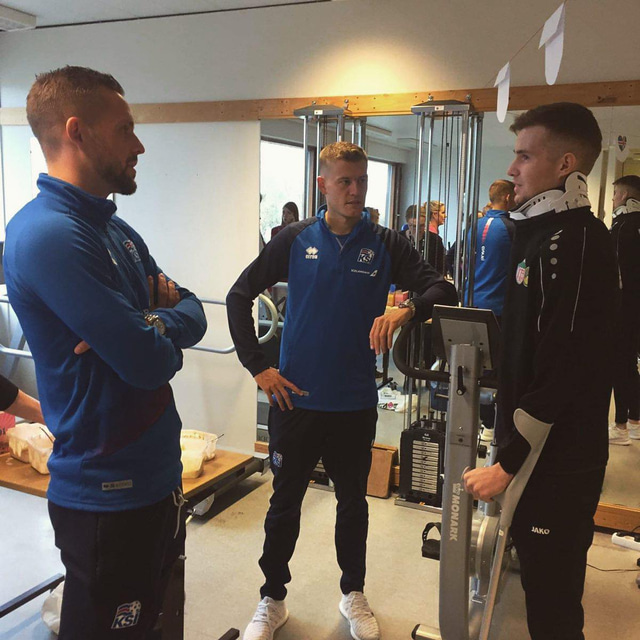 Íslensku landsliðsmennirnir Alfreð Finnbogason og Gylfi Þór Sigurðsson kíktu í dag í heimsókn Grensásdeild, endurhæfingardeild Landspítalans, en með þeim í för var Friðrik Ellert Jónsson sjúkraþjálfari landsliðsins.