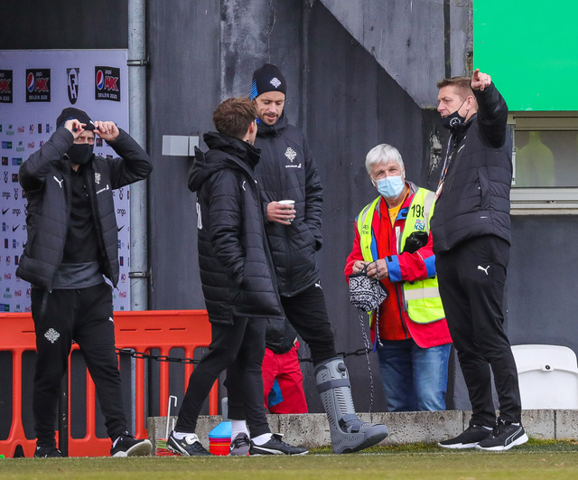 Landsliðið æfði á Kaplakrikavelli í dag fyrir leikinn gegn Danmörku annað kvöld. Kári Árnason horfði á æfinguna og mátti sjá hann í eins konar gönguspelku, hlífðarskó sem heldur ökkla og fæti stöðugum. Mynd af Kára frá Kaplakrikavelli má sjá hér að neðan.