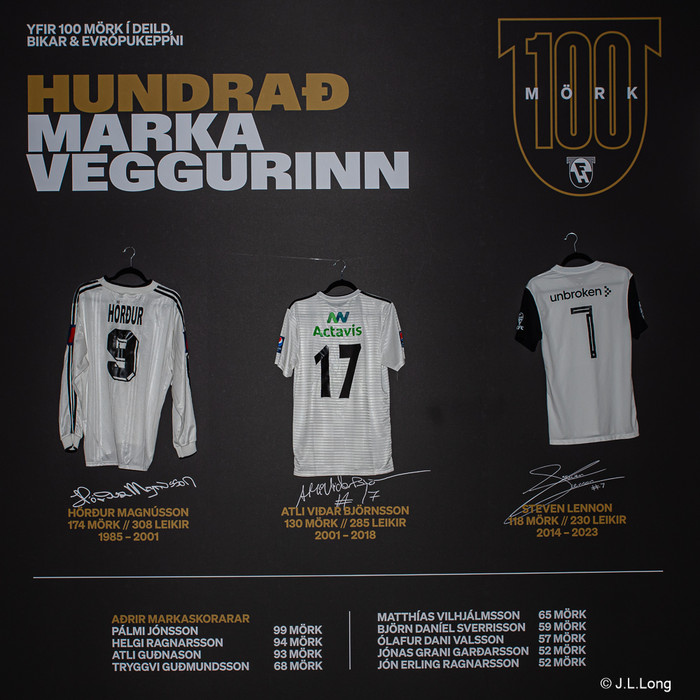FH hefur sett upp sérstakan 100 marka vegg í Kaplakrika til að heiðra leikmenn liðsins sem hafa brotið 100 marka múrinn fyrir félagið.