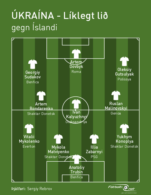 Á listanum sem eru fjarri góðu gamni í úkraínska liðinu eru Viktor Tsygankov, Roman Yaremchuk, Oleksandr Zubkov, Oleksandr Zinchenko, Yegor Yarmolyuk, Oleksandr Tymchyk og Mykhailo Mudryk.