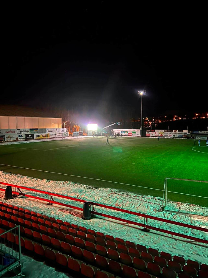 Menn sem voru kunnugir staðháttum dóu ekki ráðalausir á meðan beðið var eftir því að fá flóðljósin í gang. Það er risaskjár á vellinum og var leik Real Madrid og Manchester City í Meistaradeildinni skellt á skjáinn á meðan beðið var eftir að kveikt yrði á ljósunum. Leikur Álafoss og Kríu var stopp í um stundarfjórðung.